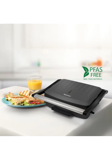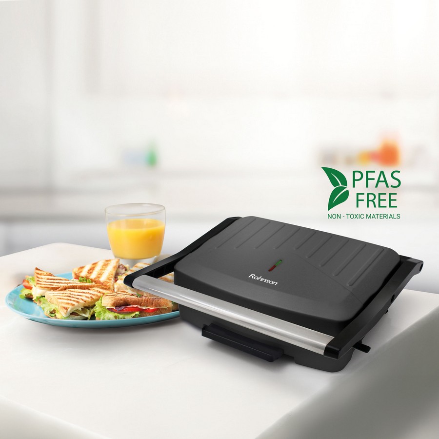 Η ασφάλεια χρήσης συναντά την λειτουργικότητα στη νέα τοστιέρα Rohnson R-2122B με πλάκα μαρμάρινης επίστρωσης μεγάλης διάστασης 23x15cm χωρίς PFAs. O κομψός σχεδιασμός, ειδικού ματ φινιρίσματος κατά των αποτυπωμάτων με ανάγλυφες λεπτομέρειες, συναντά την αντιθερμαινόμενη λαβή και τις φωτεινές ενδείξεις ετοιμότητας και λειτουργίας για μέγιστη ασφάλεια κι έλεγχο κατά το ψήσιμο. Απολαύστε γρήγορα και λαχταριστά σνακ, εύκολα, σε όλη τη διάρκεια της ημέρας.