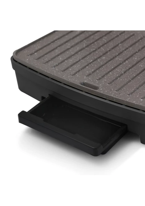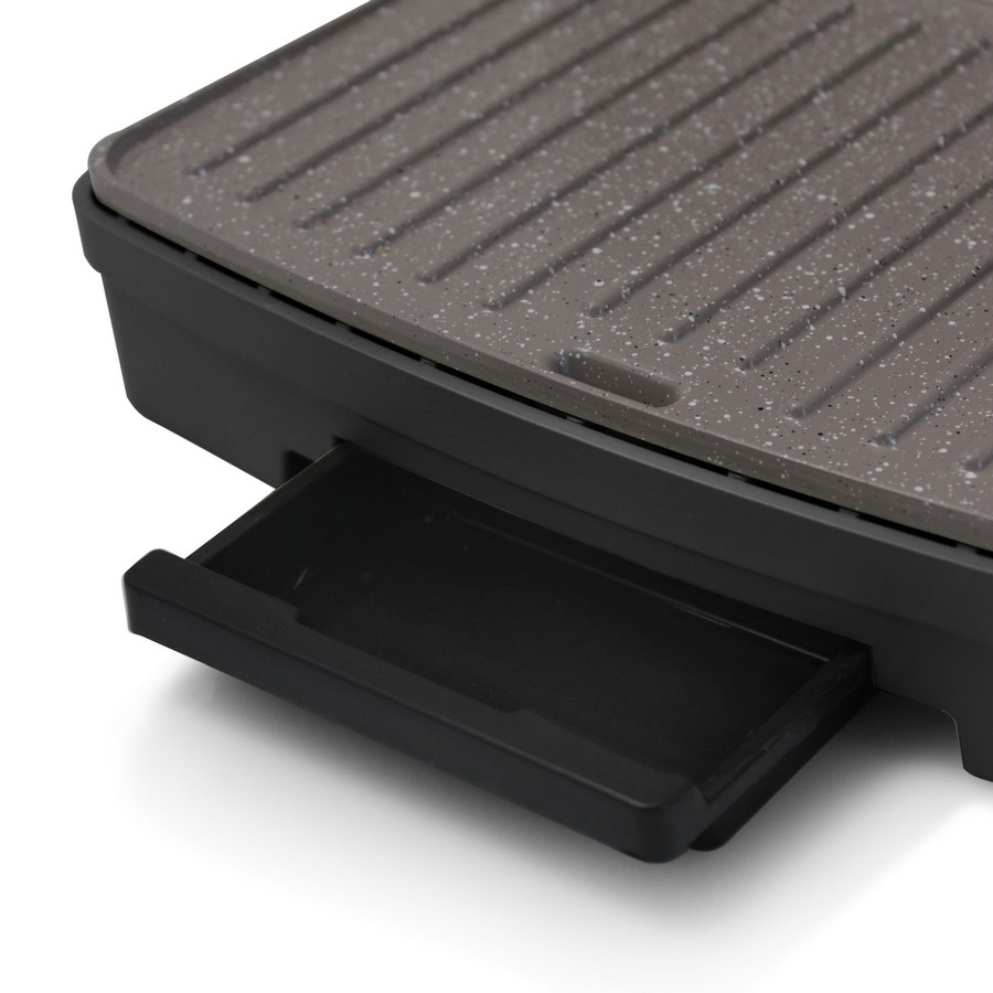 Η ασφάλεια χρήσης συναντά τη λειτουργικότητα. Ο δίσκος υπολειμμάτων συγκεντρώνει τυχόν λίπη ή ψίχουλα, και η αντιθερμαινόμενη λαβή εξασφαλίζει μέγιστη ασφάλεια κατά τη χρήση της συσκευής.