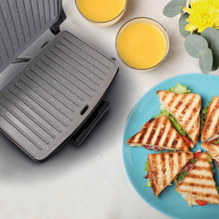 Απολαύστε τραγανό, ομοιόμορφο κι υγιεινό ψήσιμο σε τοστ, σάντουιτς, μπαγκέτες με τις πλάκες τύπου grill μεγάλης διάστασης 23x15cm, μαρμάρινης επίστρωσης, χωρίς PFAs.