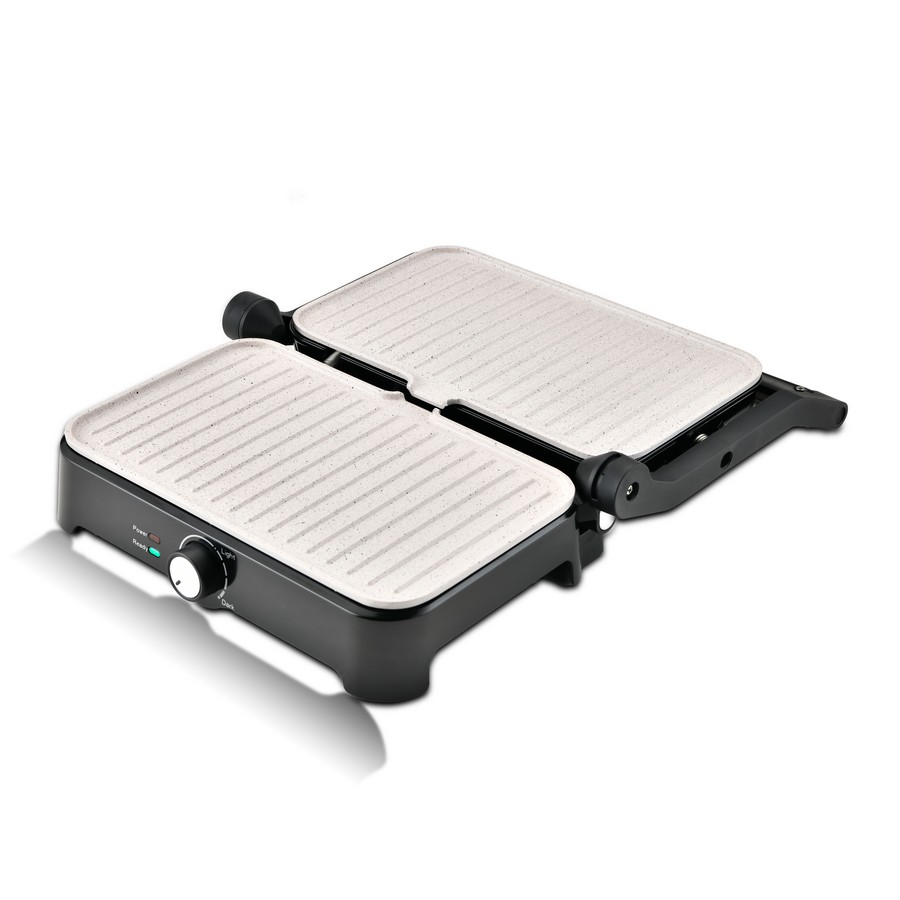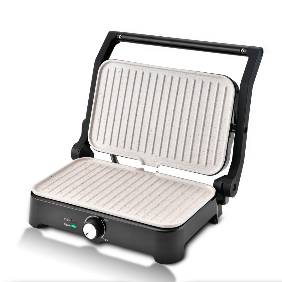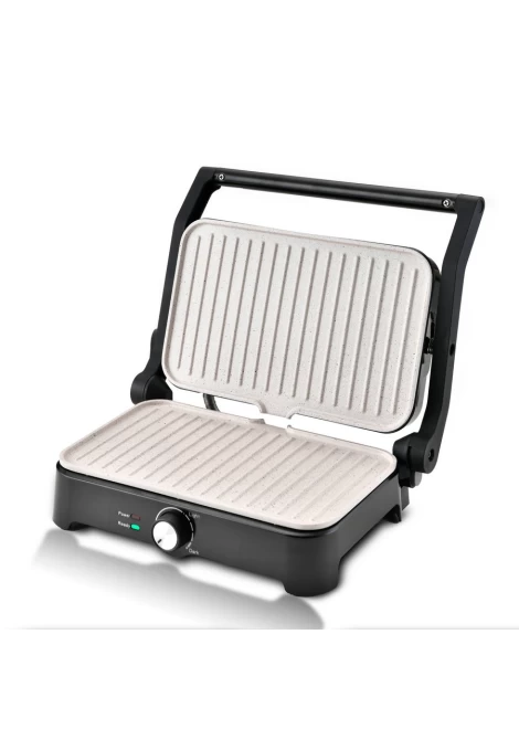 Διαθέτει αντικολλητικές πλάκες τύπου γκριλ και υψηλής ποιότητας μαρμάρινη επίστρωση, χωρίς PFAs, για υγιεινό ψήσιμο χωρίς εκπομπή τοξικών ουσιών στις τροφές, εξαιρετική αντικολλητική απόδοση σε υψηλές θερμοκρασίες κι εύκολο καθάρισμα.
