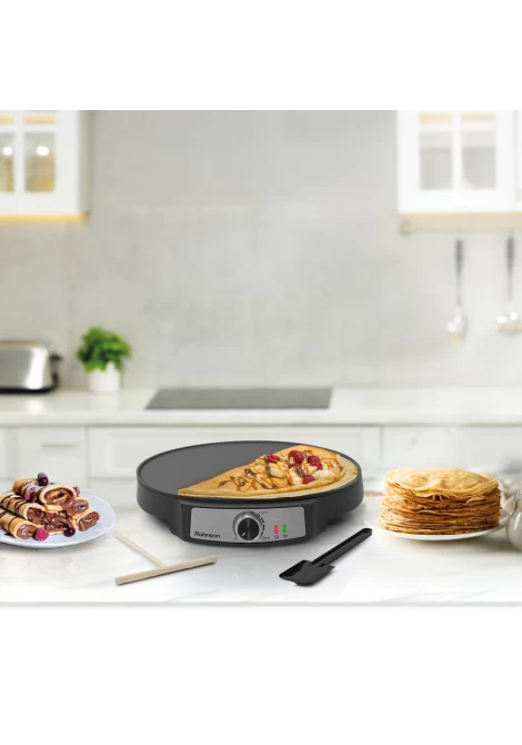 Η νέα κρεπιέρα R-2203 φέρνει τη γεύση της γαλλικής κουζίνας στο σπίτι σας. Με μεγάλη επιφάνεια ψησίματος 30cm Ø, αντικολλητική επίστρωση χωρίς PFAs και εύχρηστα αξεσουάρ, Τ-εργαλείο ζύμης και σπάτουλα, φτιάχνετε τέλειες κρέπες, pancakes και άλλες λιχουδιές εύκολα, γρήγορα και υγιεινά.