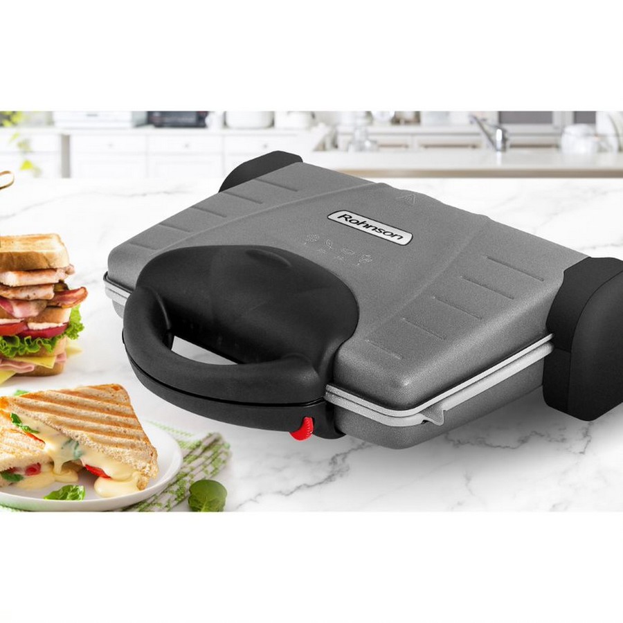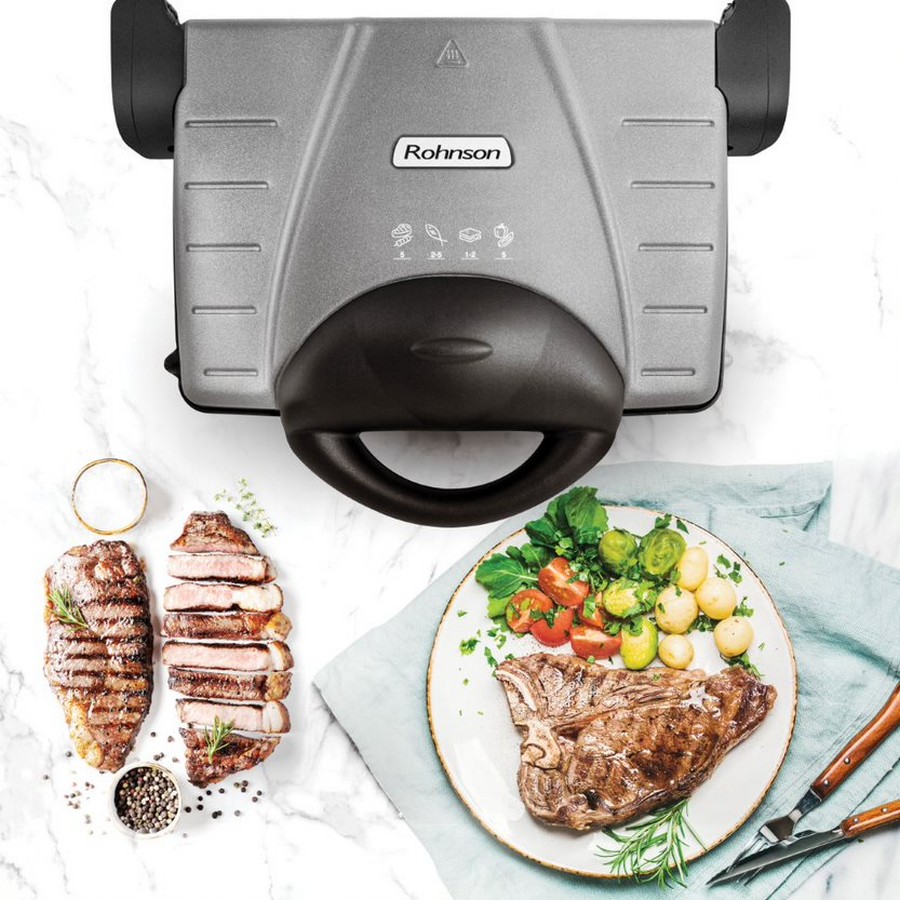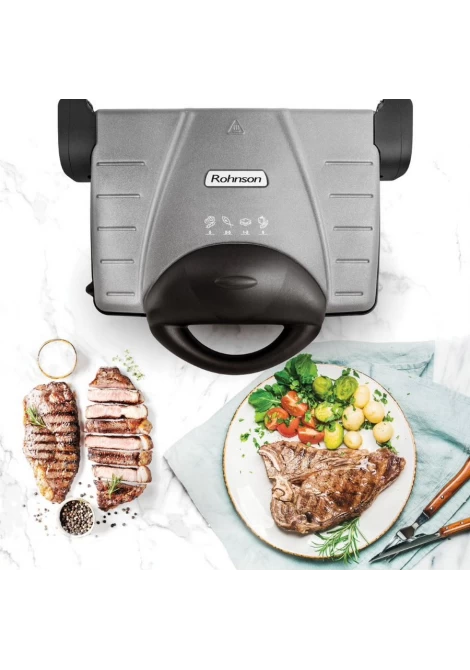 Με την γκριλιέρα-τοστιέρα της Rohnson R-2330 μπορείτε να ψήσετε αποτελεσματικά, τοστ, λουκάνικα, κοτόπουλο, μπριζόλες ή λαχανικά, διατηρώντας αναλλοίωτη τη γεύση. Διατίθεται με αντικολλητικές κεραμικές πλάκες διαστάσεων 24,4 x 33 εκ. παρέχοντας πληθώρα επιλογών ψησίματος. Με μέγιστη ισχύ 2000W προσφέρει άριστα αποτελέσματα ψησίματος. Χάρη στον ρυθμιζόμενο θερμοστάτη μπορείτε να επιλέξετε την θερμοκρασία ψησίματος, ώστε να έχετε τον απόλυτο έλεγχο για το επιθυμητό αποτέλεσμα.