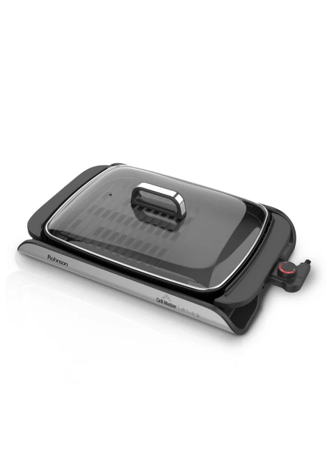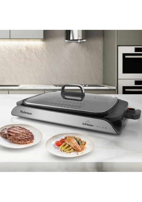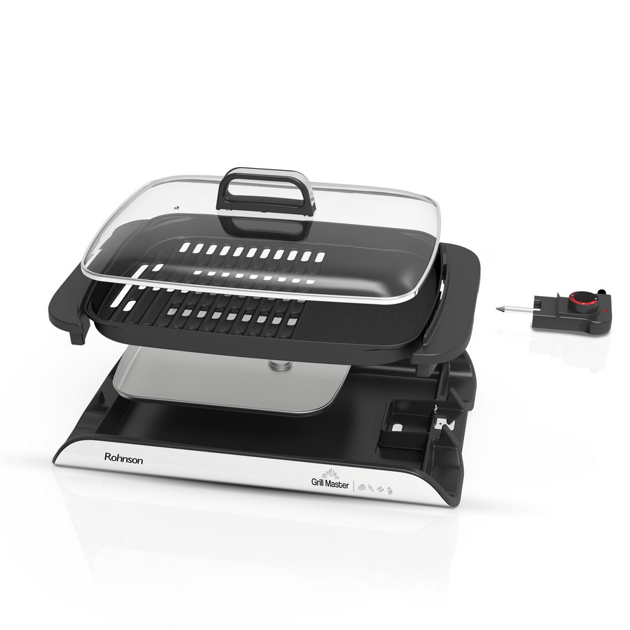 H νέα ηλεκτρική ψηστιέρα Rohnson R-2528 “Grill Master” αντικολλητική κι αποσπώμενη πλάκα μεγάλης επιφάνειας ψησίματος χωρίς PFAs & BPAs, 30x40cm, ταψάκι νερού, ανοιγμένο, γυάλινο καπάκι, ανθεκτικό στη θερμότητα είναι ιδανική για υγιεινό ψήσιμο τραγανών λαχανικών, γευστικών ψαριών, κι απολαυστικών κρεατικών με λιγότερα λίπη. Με τρία επίπεδα θερμοκρασίας προσαρμόζετε την θερμοκρασία στις ανάγκες σας, ενώ καθαρίζετε εύκολα την συσκευή αφού διαθέτει εξαρτήματα κατάλληλα για το πλυντήριο πιάτων.