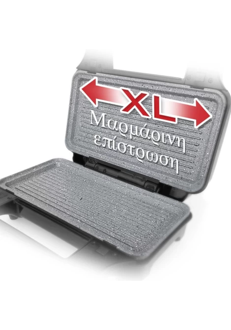 Διαθέτει πλάκες με μαρμάρινη επίστρωση, διαστάσεων 28,5×15,2 εκ., για βέλτιστη ανθεκτικότητα και διάχυση θερμότητας. Ιδανική για να ψήνετε τοστ, σάντουιτς, σουβλάκια και κρέας.