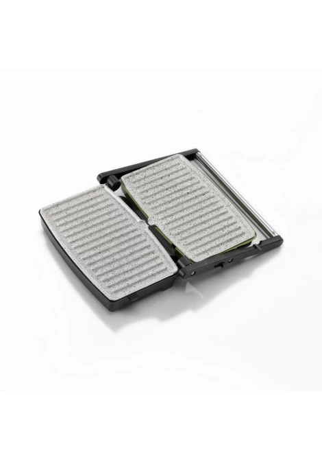 Διαθέτει αντικολλητικές πλάκες τύπου γκριλ και υψηλής ποιότητας μαρμάρινη επίστρωση, χωρίς PFAs, για υγιεινό ψήσιμο χωρίς εκπομπή τοξικών ουσιών στις τροφές, εξαιρετική αντικολλητική απόδοση σε υψηλές θερμοκρασίες κι εύκολο καθάρισμα.