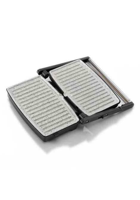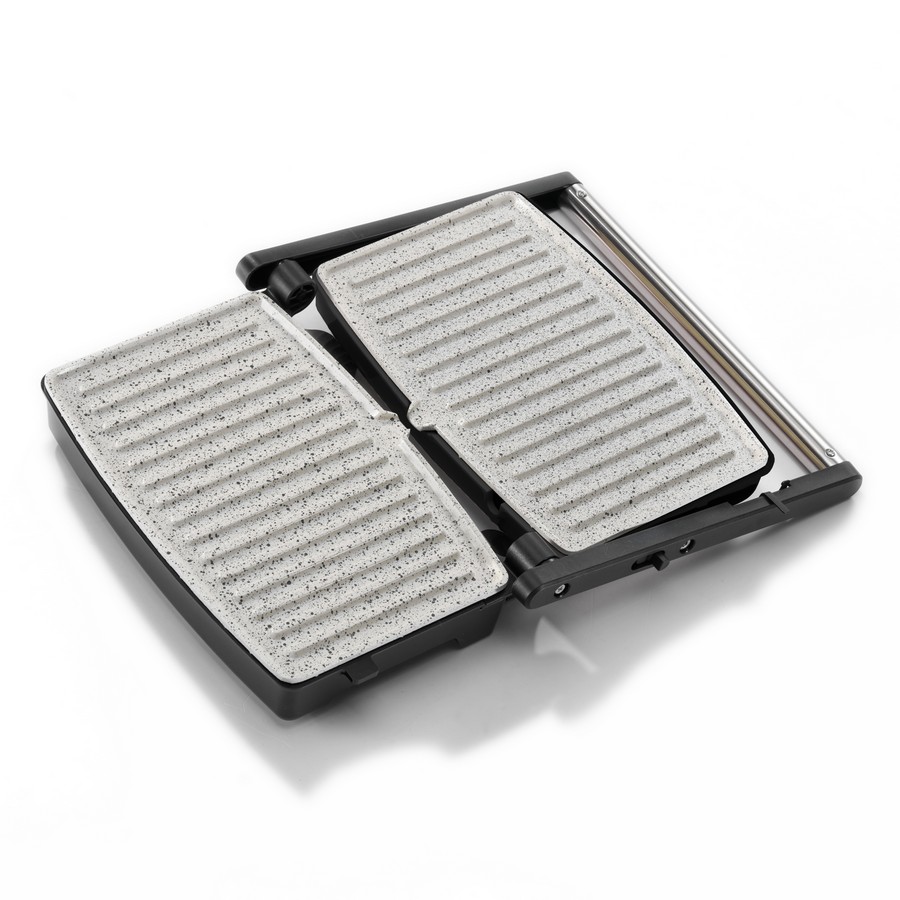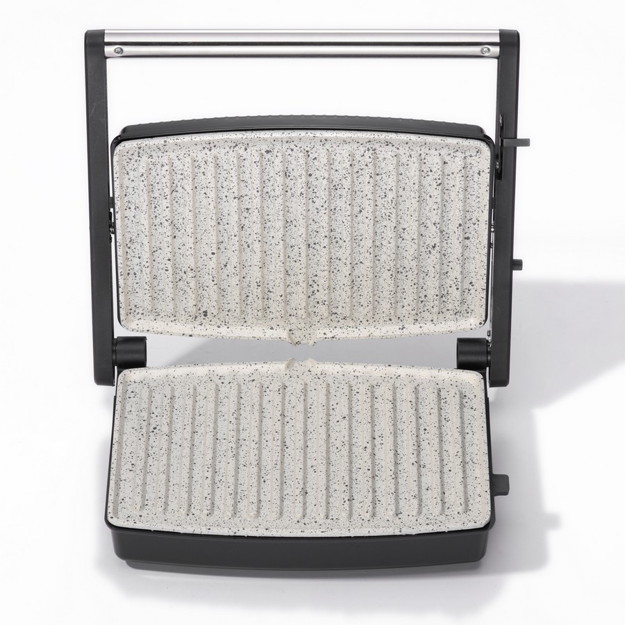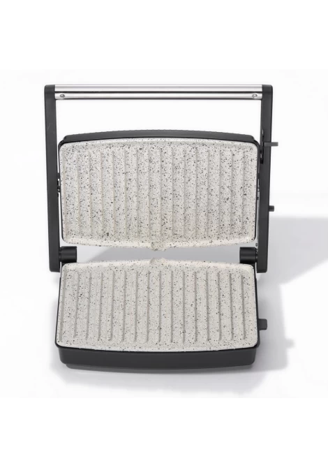 Διαθέτει αντικολλητικές πλάκες τύπου γκριλ και υψηλής ποιότητας μαρμάρινη επίστρωση, χωρίς PFAs, για υγιεινό ψήσιμο χωρίς εκπομπή τοξικών ουσιών στις τροφές, εξαιρετική αντικολλητική απόδοση σε υψηλές θερμοκρασίες κι εύκολο καθάρισμα.