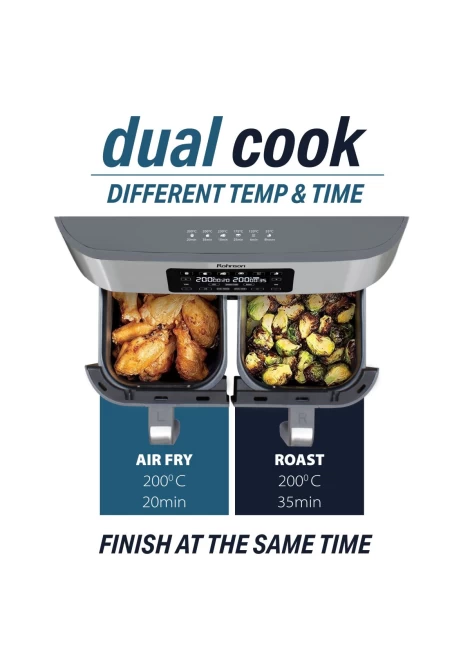 Με τους δύο ανεξάρτητους κάδους συνολικής χωρητικότητας 8.5L, η φριτέζα αέρος σάς επιτρέπει να προετοιμάσετε ταυτόχρονα δύο ίδια ή διαφορετικά γεύματα. Μπορείτε να ετοιμάσετε τηγανιτές πατάτες στον ένα κάδο και κρέας ή λαχανικά στον άλλο, έχοντας ωστόσο ολοκληρωμένα γεύματα ακριβώς την ίδια ώρα, χάρη στη λειτουργία συγχρονισμένης λήξης που διαθέτει.