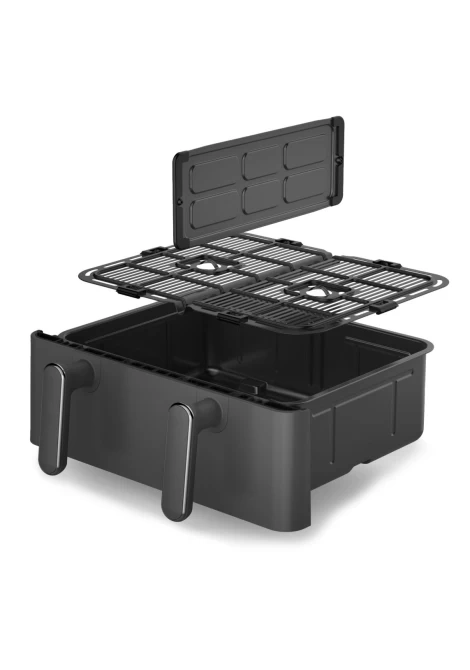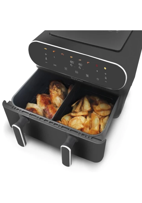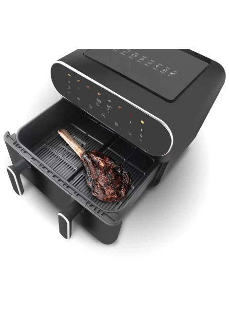 Η συσκευή διαθέτει έναν εξαιρετικά μεγάλο αποσπώμενο κάδο συνολικής χωρητικότητας 10,4L, όπου τώρα μπορείτε να απολαύσετε άφθονο χώρο για να χωρέσετε εκείνα τα μεγαλύτερα φαγητά που συνήθως μαγειρεύετε στο φούρνο. Επίσης, με το διαχωριστικό που διαθέτει, έχετε τη δυνατότητα να χωρίσετε τον κάδο σε 2 ξεχωριστούς κάδους 5.2L και να προετοιμάσετε ταυτόχρονα δύο διαφορετικά γεύματα, επιλέγοντας δύο διαφορετικές θερμοκρασίες. Μπορείτε να ετοιμάσετε τηγανιτές πατάτες στον ένα κάδο και κρέας ή λαχανικά στον άλλο, έχοντας ωστόσο ολοκληρωμένα γεύματα ακριβώς την ίδια ώρα, χάρη στη λειτουργία συγχρονισμένης λήξης που διαθέτει.
