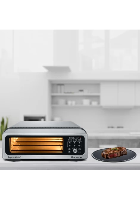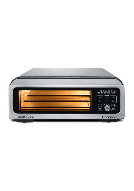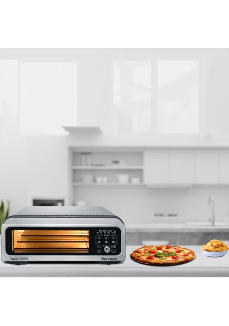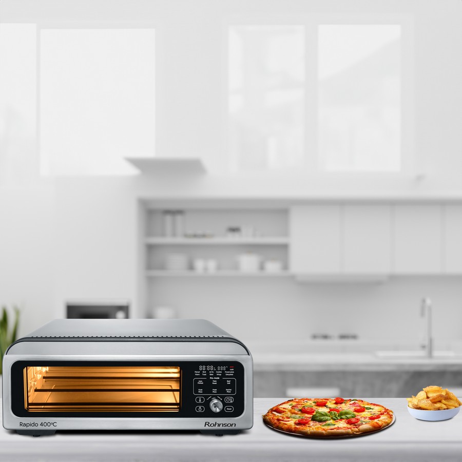 Το νέο φουρνάκι Πίτσας και Φριτέζας Αέρος της Rohnson R-2880 Rapido 400°C, είναι η απόλυτη πολυχρηστική συσκευή 18 λίτρων, με ισχύ 2000W και θερμοκρασία έως 400°C. Σχεδιασμένο για τέλειες πίτσες 30cm σε τέσσερα στυλ (κατεψυγμένη, κρούστα, φρέσκια, ξυλόφουρνου) και με έξι επίπεδα κρούστας, προσαρμόζεται σε κάθε γούστο. Εκτός από πίτσα, όμως, λειτουργεί και σαν air fryer, προσφέροντας επιλογές για ψήσιμο, τηγάνισμα χωρίς λάδι, ψήσιμο σε σχάρα και ζέσταμα, καλύπτοντας ένα ευρύ φάσμα γευμάτων όπως πατάτες, κρέας, λαχανικά, ακόμα και γλυκά, ενώ το διπλό τζάμι που διαθέτει, σας βοηθάει να παρακολουθείτε την πορεία προετοιμασίας του φαγητού ανά πάσα στιγμή. Ιδανικό για εύκολα και υγιεινά καθημερινά γεύματα!