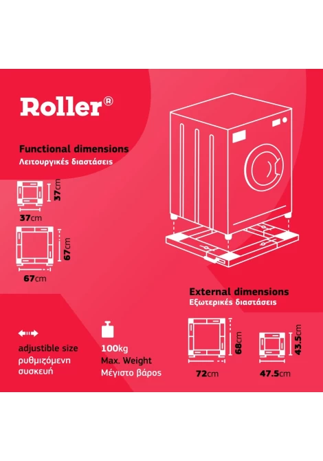 Η απόλυτη λύση για την εύκολη μετακίνηση και τη σταθερή στήριξη των λευκών συσκευών σας. Είτε θέλετε να καθαρίσετε τον χώρο σας, να μετακινήσετε τη συσκευή σας για συντήρηση ή να δημιουργήσετε μια ευέλικτη διάταξη, η τροχήλατη βάση πλυντηρίου σάς εξασφαλίζει άνεση, εργονομία και προστασία. Σχεδιασμένη με έξυπνο σύστημα τροχών και φρένων, παρέχει ασφάλεια και σταθερότητα ακόμα και για τις πιο βαριές συσκευές.