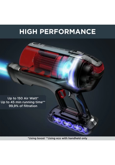 Επαναφορτιζόμενη ηλεκτρική σκούπα που δεν μοιάζει με καμιά άλλη: Ισχυρή απορρόφηση έως και 150 Air Watt*, μπαταρία με μεγάλη διάρκεια με χρόνο αυτονομίας έως και 45 λεπτά** φιλτράρισμα σε ποσοστό 99,9% των μικροσκοπικών σωματιδίων σκόνης, των αλλεργιογόνων και των ακάρεων.