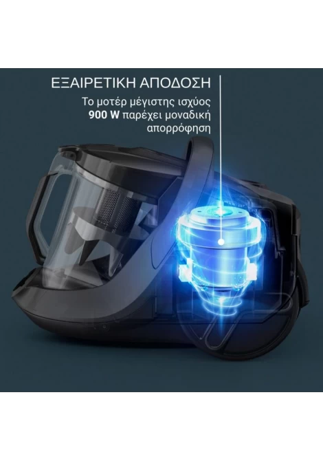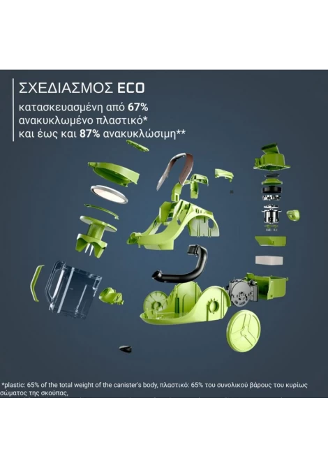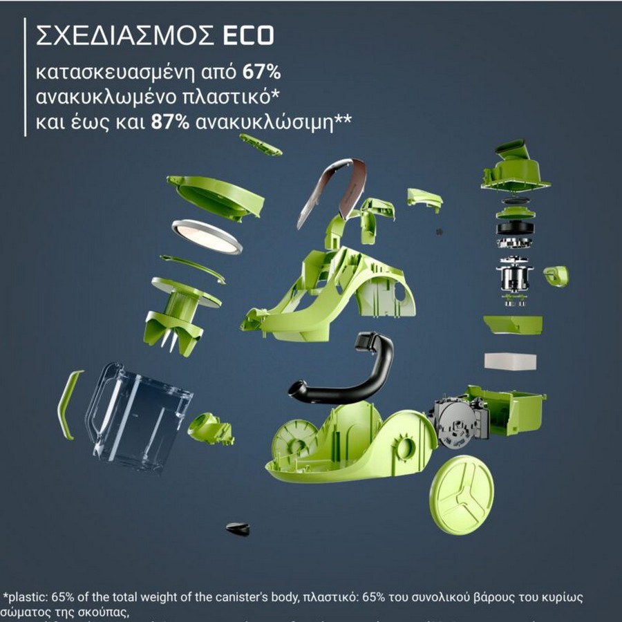 Το μοτέρ χαμηλής κατανάλωσης έως και 900 W προσφέρει εξαιρετική απορρόφηση για άψογα καθαριστικά αποτελέσματα σε όλους τους τύπους δαπέδων και επιφανειών, με βιώσιμο σχεδιασμό κατασκευασμένο από 67% ανακυκλωμένο πλαστικό και ανακυκλώσιμο έως και 87%. Αυτή η ηλεκτρική σκούπα είναι εξοπλισμένη με δοχείο σκόνης XXL για μεγαλύτερη αυτονομία και άνεση.