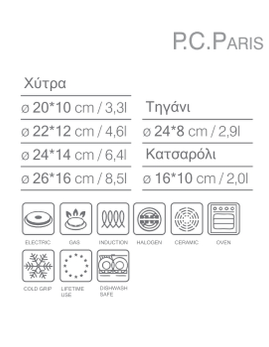 • Κάθε σκεύος από τη σειρά P.C.PARIS είναι κατασκευασμένο από ανοξείδωτο ατσάλι 18/10 υψηλής ποιότητας, υλικό εξαιρετικά ανθεκτικό και υγιεινό.