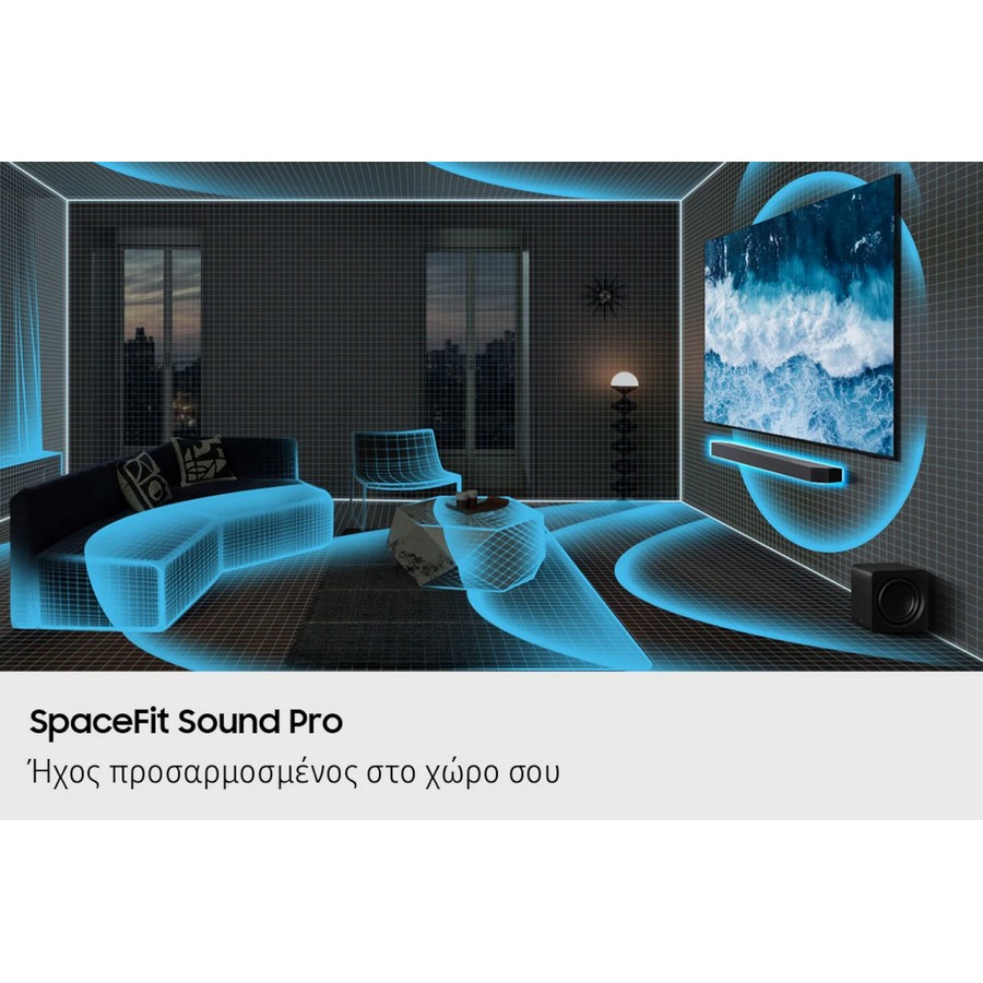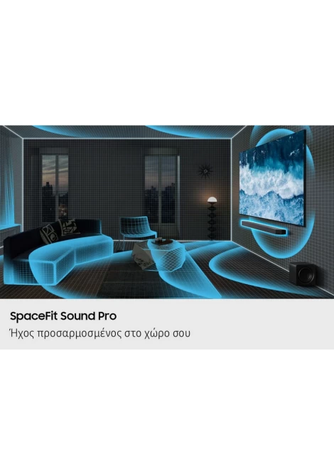 Απολαύστε εντυπωσιακό ήχο, προσαρμοσμένο στο δωμάτιό σας. Το soundbar αναλύει τον χώρο και προσαρμόζει αντίστοιχα τον ήχο — ακόμη και τα μπάσα — για μία καθαρή, καθηλωτική εμπειρία.