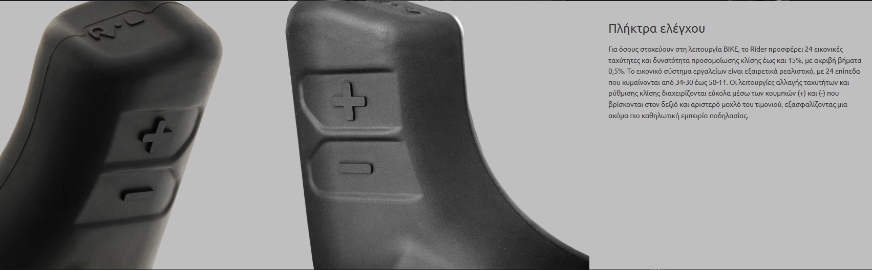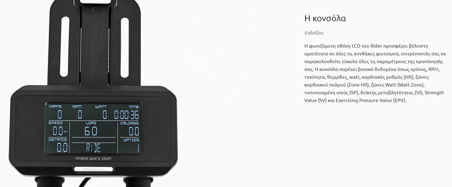 | Κονσόλα LCD | H LCD οθόνη του Rider με οπίσθιο φωτισμό, προσφέρει βέλτιστη ορατότητα σε όλες τις συνθήκες φωτισμού, επιτρέποντας σας να παρακολουθείτε εύκολα όλες τις παραμέτρους της προπόνησής σας. |