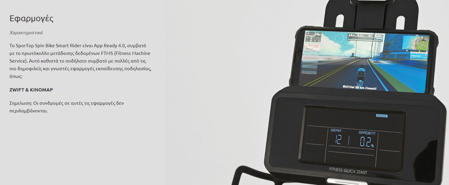 | Εφαρμογές | App Ready 4.0. Πρωτόκολλο μετάδοσης δεδομένων/εφαρμογής FTMS (Fitness Machine Service) που το καθιστά συμβατό με τις μεγαλύτερες και πιο δημοφιλείς εφαρμογές στην ποδηλασία: ZWIFT, KINOMAP*, κλπ (*δεν περιλαμβάνονται οι συνδρομές). |