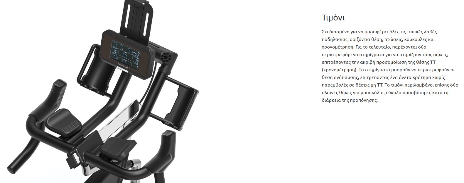 | Τιμόνι | Σχεδιασμένο για να προσφέρει τις τυπικές λαβές ποδηλασίας: οριζόντια θέση, χαμηλά χέρια, μοχλούς και χρονομέτρηση. Για το τελευταίο, παρέχονται δύο περιστρεφόμενα στηρίγματα για να στηρίζουν τους πήχεις. Αυτό επιτρέπει την ακριβή προσομοίωση της θέσης χρονομέτρησης. Οι βάσεις μπορούν να περιστραφούν στη θέση ανάπαυσης, επιτρέποντας έτσι ένα άνετο κράτημα χωρίς παρεμβολές με τα χέρια σε λαβές μη TT (χρονομέτρησης). Το σώμα του τιμονιού περιλαμβάνει επίσης 2 πλευρικές θήκες δοχείων που είναι εύκολα προσβάσιμες κατά τη διάρκεια της προπόνησης. Μικρομετρική κάθετη και οριζόντια ρύθμιση. |