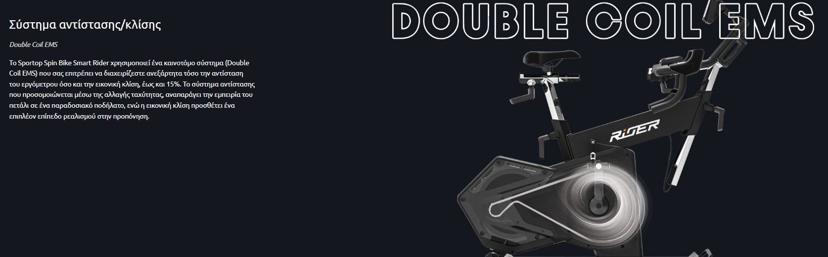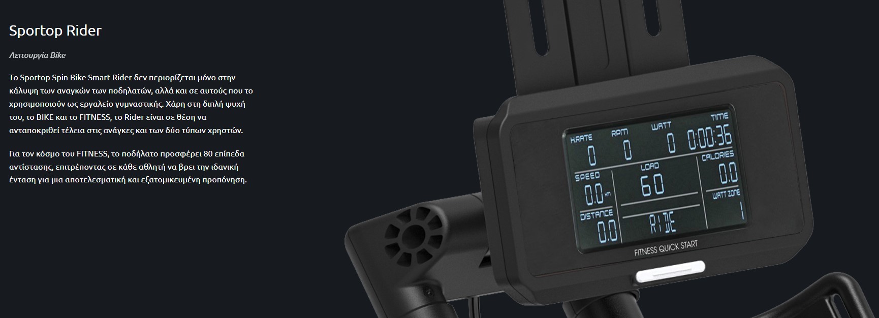 Το Sportop Spin Bike Smart Rider είναι ένα εργομετρικό ποδήλατο με επαγωγικό φρένο διπλού πηνίου, που προσομοιώνει 24 εικονικές αναλογίες. Οι πολυμικρομετρικές ρυθμίσεις του αλληλοεπιδρούν με όλες τις πιο δημοφιλείς εφαρμογές όπως Zwift και Kinomap, καθιστώντας το ιδανική εναλλακτική για τα έξυπνα ποδήλατα των πιο διάσημων εμπορικών σημάτων. Είναι επίσης σε θέση να ανταποκριθεί στις προσδοκίες απόδοσης των πιο απαιτητικών χρηστών (ισχύς έως 2000 Watt), εξασφαλίζοντας σημαντική οικονομική εξοικονόμηση, χωρίς καμία θυσία.