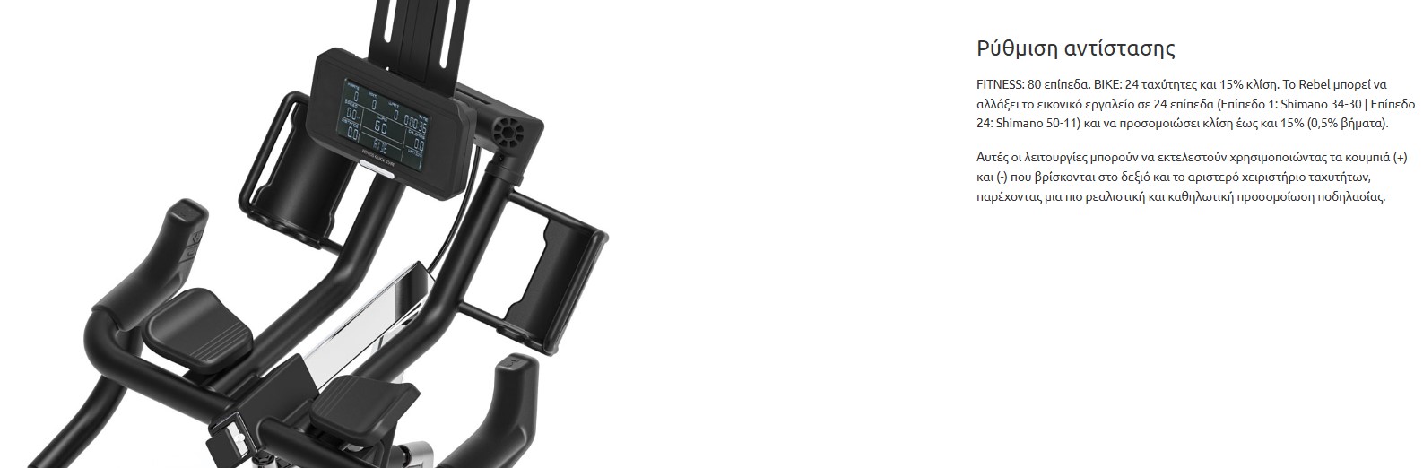 | Ρυθμίσεις | FITNESS: 80 επίπεδα. ΠΟΔΗΛΑΤΟ: 24 ταχύτητες και 15% κλίση. Το Rebel μπορεί να αλλάξει την εικονική σχέση μετάδοσης σε 24 επίπεδα (επίπεδο 1: Shimano 34-30 | Επίπεδο 24: Shimano 50-11) και να προσομοιώσει την κλίση έως και 15% (βήματα 0,5), λειτουργίες που μπορούν να εκτελεστούν χρησιμοποιώντας τα κουμπιά (+) και (-), προσφέροντας ρεαλιστική και ομοιόμορφη προσομοίωση στα δεξιά και στα αριστερά της κλίσης. |