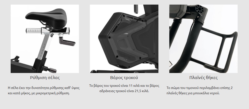 | Πληροφορίες | Χρόνος, RPM, ταχύτητα, θερμίδες, Watt, HR Zone, Watt Zone, SP, VI, SV, EPV. Κλίση: Συγχρονισμένη και διαδραστική (APP) κατά την λειτουργία του ποδηλάτου. |