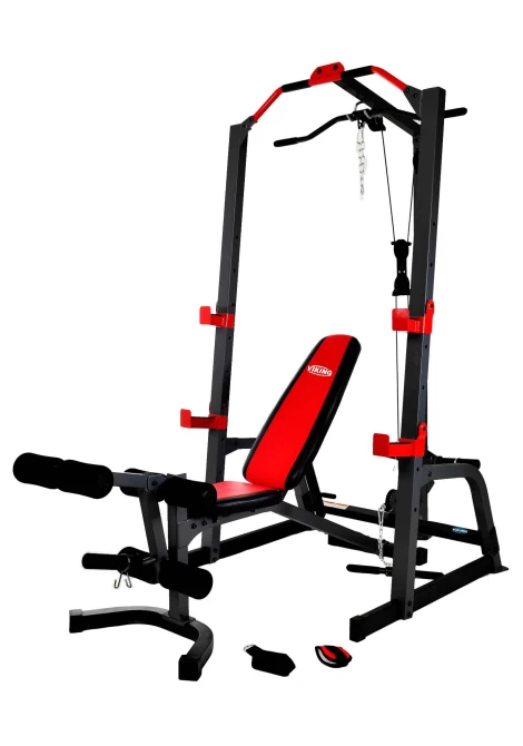 Power Rack με ενσωματωμένη υψηλή και χαμηλή τροχαλία λέξεων και ελεύθερο ρυθμιζόμενο πάγκο με σταθμό εκγύμνασης ποδιών.