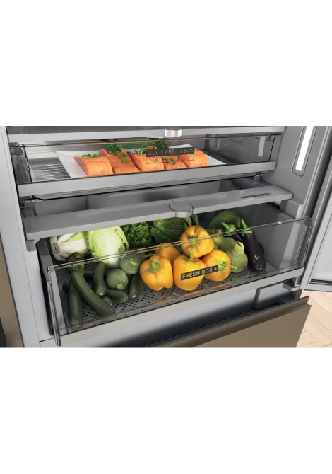 Fresh Box+ µε Fresh Pad: Συρτάρι αποθήκευσης µε βραχίονες φρούτων & λαχανικών µε δυνατότητα ρύθµισης της υγρασίας για διατήρηση της φρεσκάδας τους έως και 15 ηµέρες και ειδική επίστρωση επεξεργασµένη µε την τεχνολογία Microban SilverShield® που απορροφά το πλεόνασµα υγρασίας, αποτρέποντας την ανάπτυξη βακτηρίων κατά 99,9%