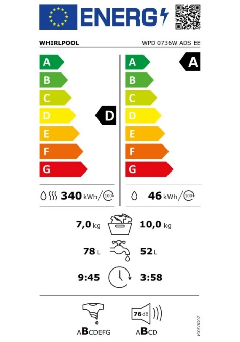 • Κατανάλωση ενέργειας (kWh/100 κύκλους στέγνωμα) 340/100 & (kWh/100 κύκλους πλύση) 46 στο πλύσιμο, κατανάλωση νερού στο πρόγραμμα eco στην πλύση 52 (L), και στο στέγνωμα 78 (L)